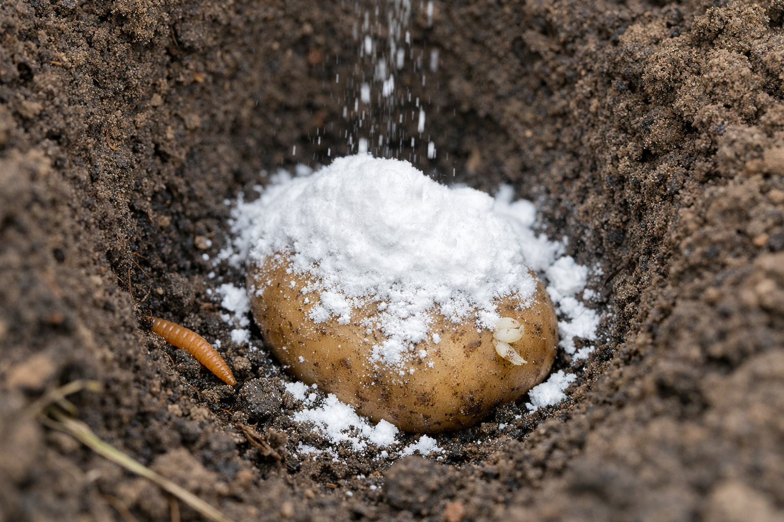 Strö aldrig pulvret direkt på späda gröna potatisskott, eftersom direktkontakt med den koncentrerade alkalin garanterat kommer att orsaka allvarliga kemiska brännskador på växtvävnaden.