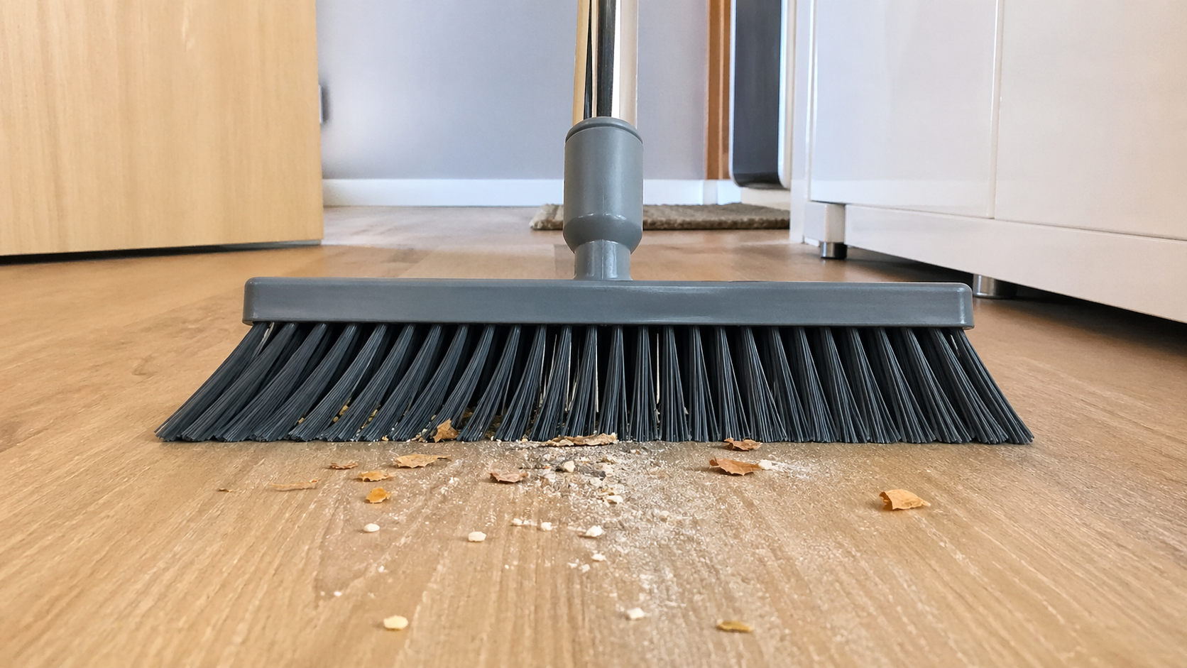 Ergonomi i rymden dikterar sina egna regler. Du ska inte bara ta bort skräp, du ska också förhindra att det sprids i hela lägenheten. Detta gäller särskilt i entrén, där det ansamlas slipande partiklar som repar golvet.